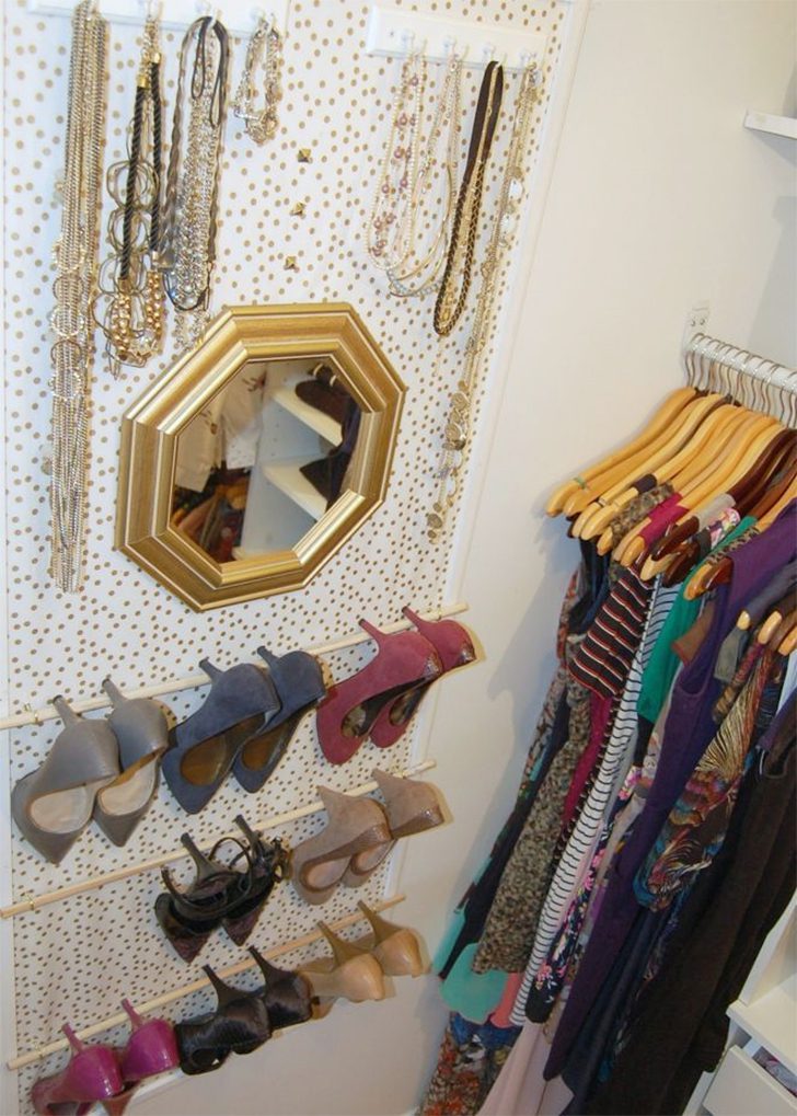 Install a rack to transform the unused space behind a room or closet door into a versatile storage hub. This hack is ideal for hanging jewelry, shoes, and other accessories. Simply attach a multi-purpose organizer with hooks and pockets to the door using sturdy over-the-door hooks that ensure stability without needing tools.