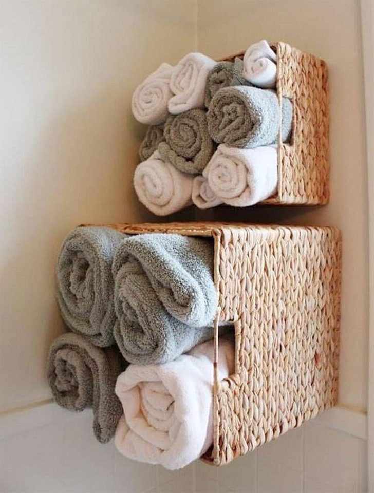 How gorgeous is this arrangement? Mounting baskets on walls is an elegant way to store and display rolled-up or folded blankets and towels, keeping them within easy reach while saving space.