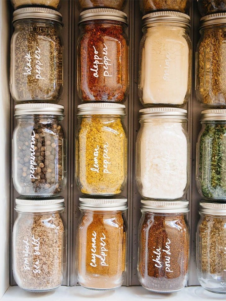 Revamp a spice drawer or cupboard by switching to small, transparent jars for a uniform and accessible setup. Begin by transferring spices into these clear containers, making identification easier and keeping contents fresh.