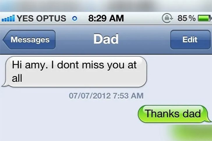 Amy received a text from her dad that read, “I don’t miss you at all.” Confused and amused, Amy could only respond with a sarcastic, “Thanks, Dad.” This funny exchange stands out because parents typically send sweet messages expressing their love and longing to see their children. Amy’s dad, however, chose humor over sentiment, making for an unexpected and entertaining moment.