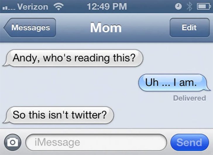 Andy received a text from his mother, who was clearly puzzled by social media. She had accidentally posted a private message on her Twitter and then texted Andy to confirm who could read her messages. “Andy, who all are reading my messages?” she asked, concerned.