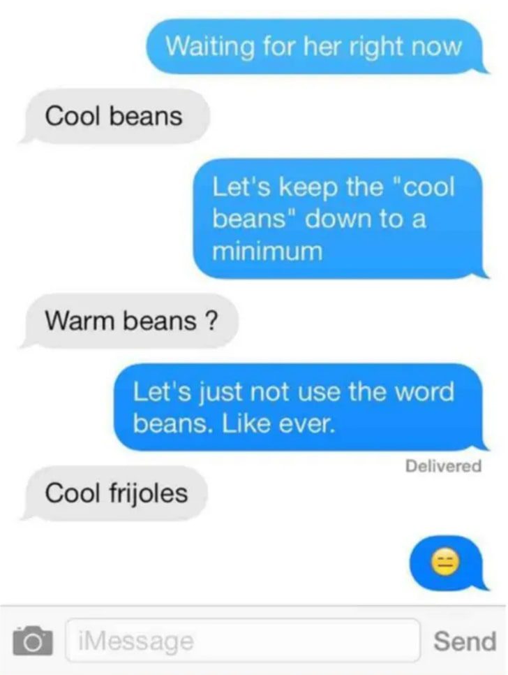 A person received a series of texts from their parent, who was clearly trying to fit in by using the slang expression “cool beans.” The child, hoping to curb the awkward use of outdated slang, suggested keeping the phrase to a minimum. The parent, undeterred, responded with “warm beans” and then escalated to “cool frijoles,” trying the Spanish translation.
