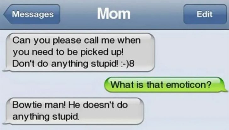 The mother replied that it was “Bowtie man,” a character she believed didn’t do anything stupid. When parents try to use modern texting symbols, many of them just invent a few emoticons along the way! While it may be well-intentioned, the person at the other end may not even understand what it meant!