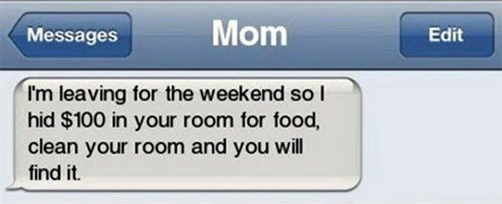 Well, if it isn’t the classic parenting trick of combining chores with a reward! A mother texted her kid, informing them she was leaving for the weekend and had hidden $100 in their room for food. The catch? They would have to clean their room to find it.