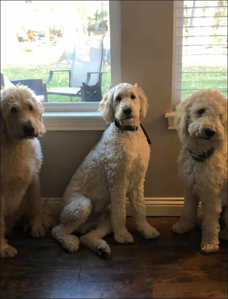 Inside a room are three large, fluffy dogs posing for the camera in the cutest possible poses. A window in the background reveals a black cat sitting close to a patio chair and glaring at the dogs. The “Peeping Tom” gives the scene an exceptional twist.