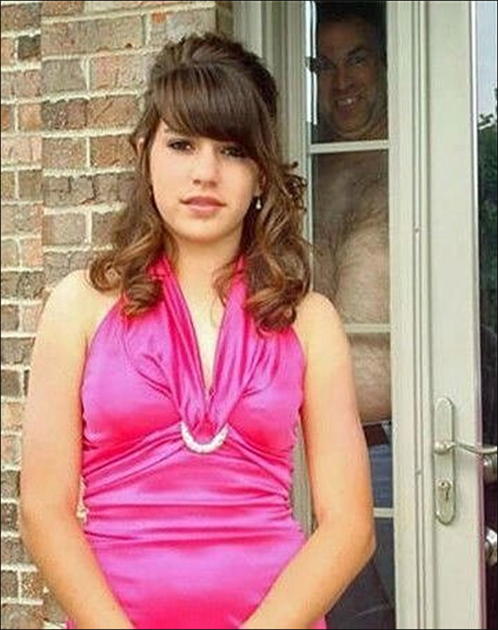 Ready for what looks to be a prom or other formal event, a young woman in a bright pink halter dress stands elegantly in front of a glass door. Unaware of the events behind her, an older family member without a shirt gives a cheeky smile from behind the glass door, photobombing the classy photo.