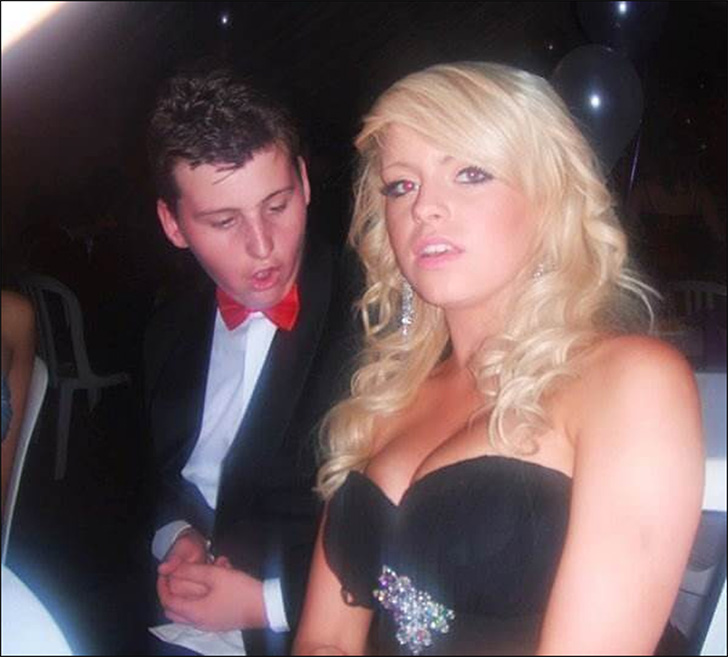 At what seems to be a formal event, a young couple sits together, capturing a silly and viral moment. Unaware of the happenings around her, the blonde woman in a black embellished strapless dress poses for the camera. Dressed in a black suit and white shirt, the man has his mouth open in amazement, looking at the woman’s chest area.