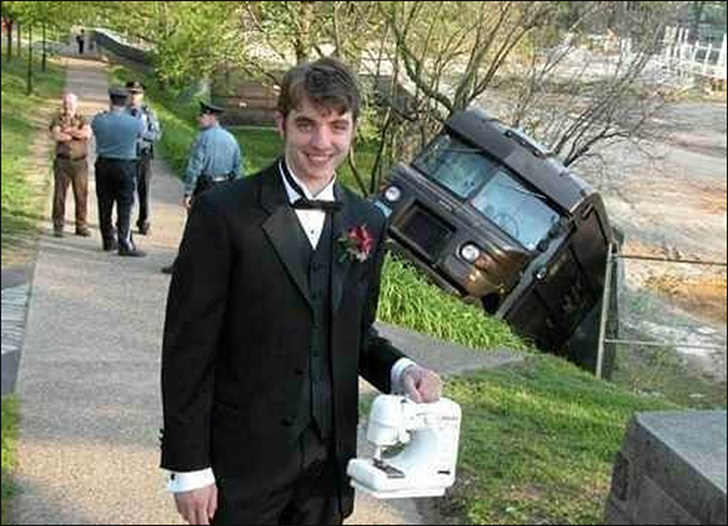 Dressed to impress, a young man in a sharp black tuxedo with a bow tie and a red boutonniere smiles at the camera, holding a small sewing machine. Behind him, a delivery truck has veered off the path and is partially tilted into a ditch, with several police officers present to potentially evaluate the scene.