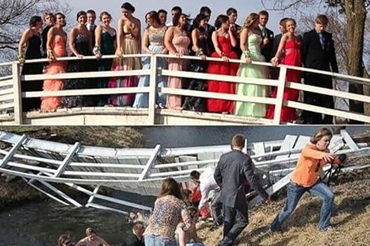 This two-part image captures a group of high school students from Nebraska taking an unintended dip during a photoshoot. In the top half, the students pose along the railing of a wooden bridge, all smiling. The bottom half reveals the bridge collapsed, sending the well-dressed teens into the water below.