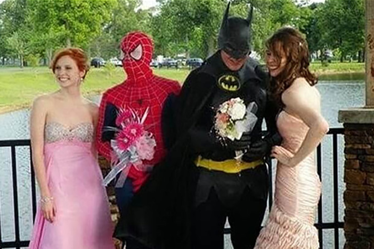 Even though gowns and tuxedos are typically worn for formal gatherings, adding costumes adds a special touch. Superhero costumes representing strength and fun have become more popular for various occasions. The perfect balance of sophistication and playfulness is captured in this photo, creating a truly memorable occasion.